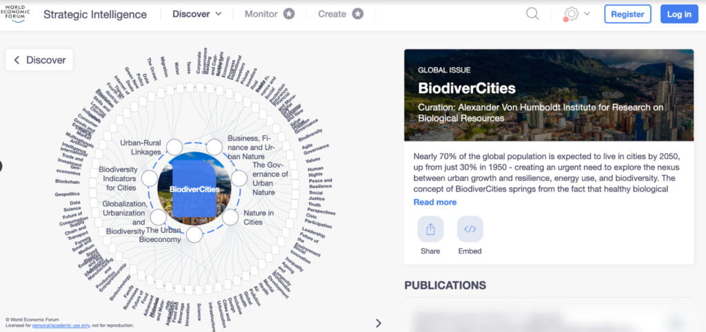 La segunda plataforma, Strategic Intelligence, alojará un Mapa de Transformación sobre BiodiverCiudades, cuyo contenido inicial ha sido desarrollado de forma conjunta entre el Foro y el Instituto Humboldt. Los mapas de transformación (Transformation Maps) son una herramienta de conocimiento dinámica que permite explorar un concepto y acceder a contenidos, publicaciones y las últimas investigaciones y análisis extraídos de las principales instituciones de investigación y medios de comunicación de todo el mundo. También permite interactuar con otros temas de interés y actualidad, lo que evidencia las interconexiones entre diversos factores de transformación y permite compilar información relevante para respaldar la toma de decisiones mejor informada.